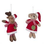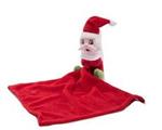 PELUCHE PERE NOEL ROUGE ET BLANC AVEC BOTTES VERTES TENANT DANS SES MAINS UN DOUDOU ROUGE