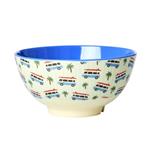 BOL de face intérieure bleue et de face extérieure représentant des vans ainsi que des palmiers