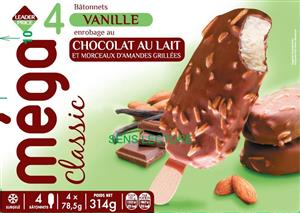 Méga Classique – 4 Bâtonnets Vanille enrobage chocolat au lait et morceaux d’amandes grillées – 314g / 440 ml – Leader Price