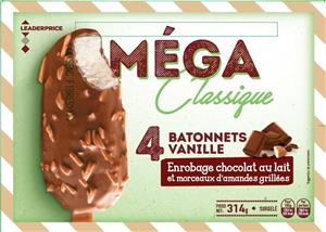 4 MEGA Classique bâtonnets vanille enrobage chocolat au lait et morceaux d’amandes grillées 314g / 440ml LEADER PRICE