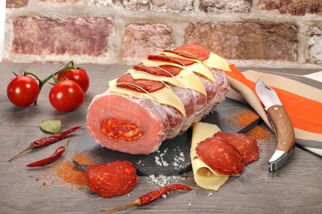 - Rôti de porc élaboré de 4kg ou 1 kg. Rôti farci avec une farce merguez porc, couvert avec des tranches d'Emmental et de Chorizo, le tout enveloppé dans de la crépine.