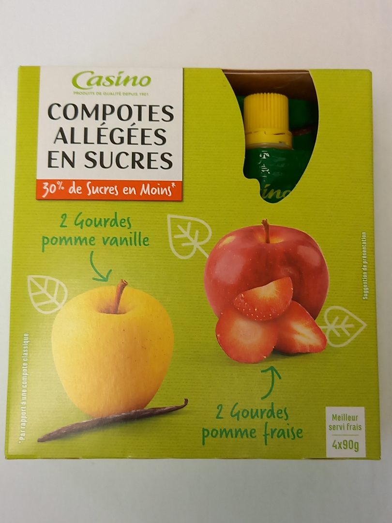 Gourdes de compotes de pommes vanille et de pommes fraises allégées en sucres 4x90g Casino