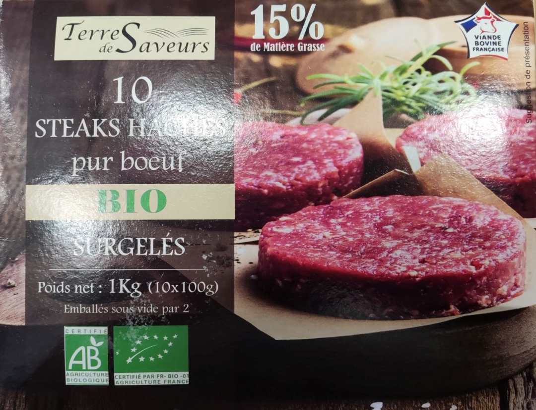 - Boite steaks hachés pur boeuf BIO 1Kg, contenant 5 poches sous-vides de 2x100g.