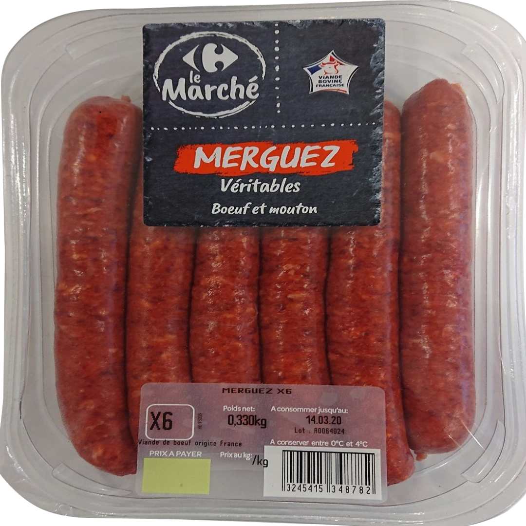 - MERGUEZ VERITABLES BOEUF MOUTON x6 330G CARREFOUR