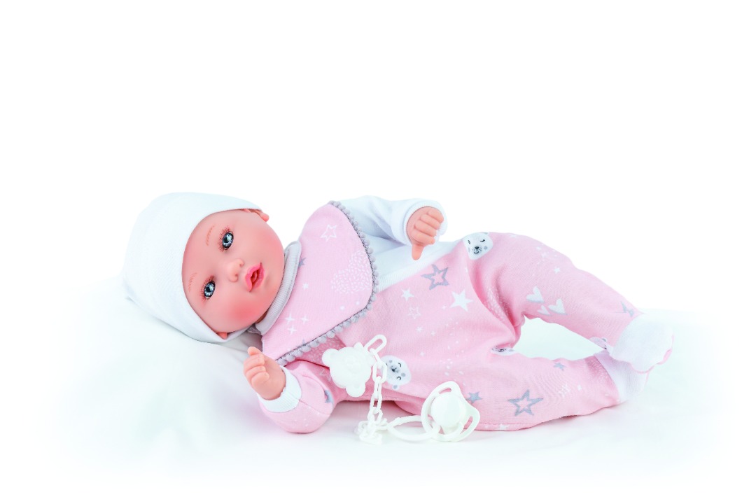 - Poupon 40cm avec corps mou. Pyjama et bavoir rose ou bleu, bonnet blanc. Boite cadeau.