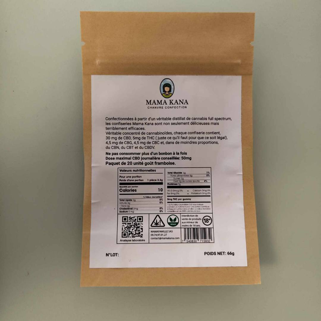 - Tous les produits ayant comme intitulé "Paquet de 5 unité goût framboise" et "Paquet de 5 unité goût pastèque" et "Paquet de 5 unité goût menthe" dans un sachet kraft ou dans un sachet bleu avec comme intitulé "Bonbons Cannabis". Les bonbons sont ronds, de couleur rouge, vert clair et vert foncé, avec du sucre autour.