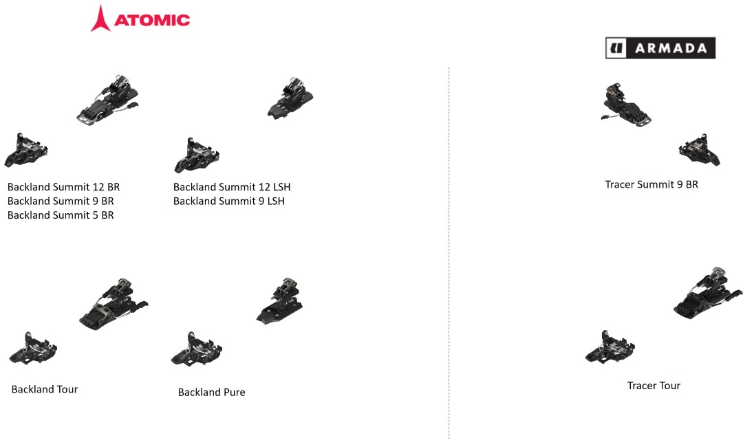 - Armada N TRACER SUMMIT (9 BR Black) Armada N TRACER TOUR (Black) Atomic N BACKLAND PURE (Black/Gunmetal) Atomic N BACKLAND SUMMIT (12 BR, 12 LSH, 5 BR, 9 BR, 9 LSH Black/Gunmetal) Atomic N BACKLAND TOUR (Black/Gunmetal)