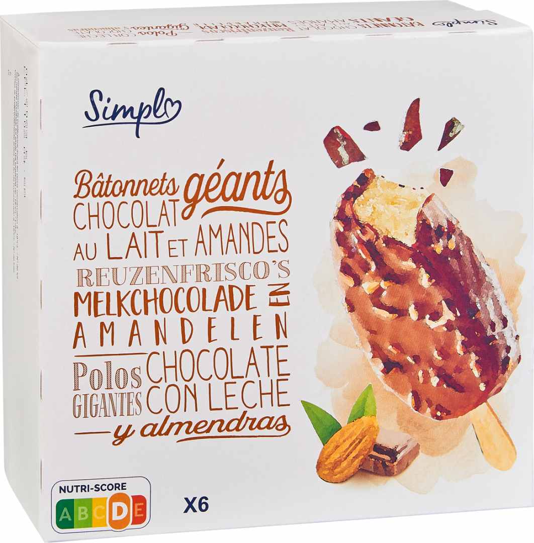 - 6 Bâtonnets glace Vanille enrobage chocolat au lait et Amandes
