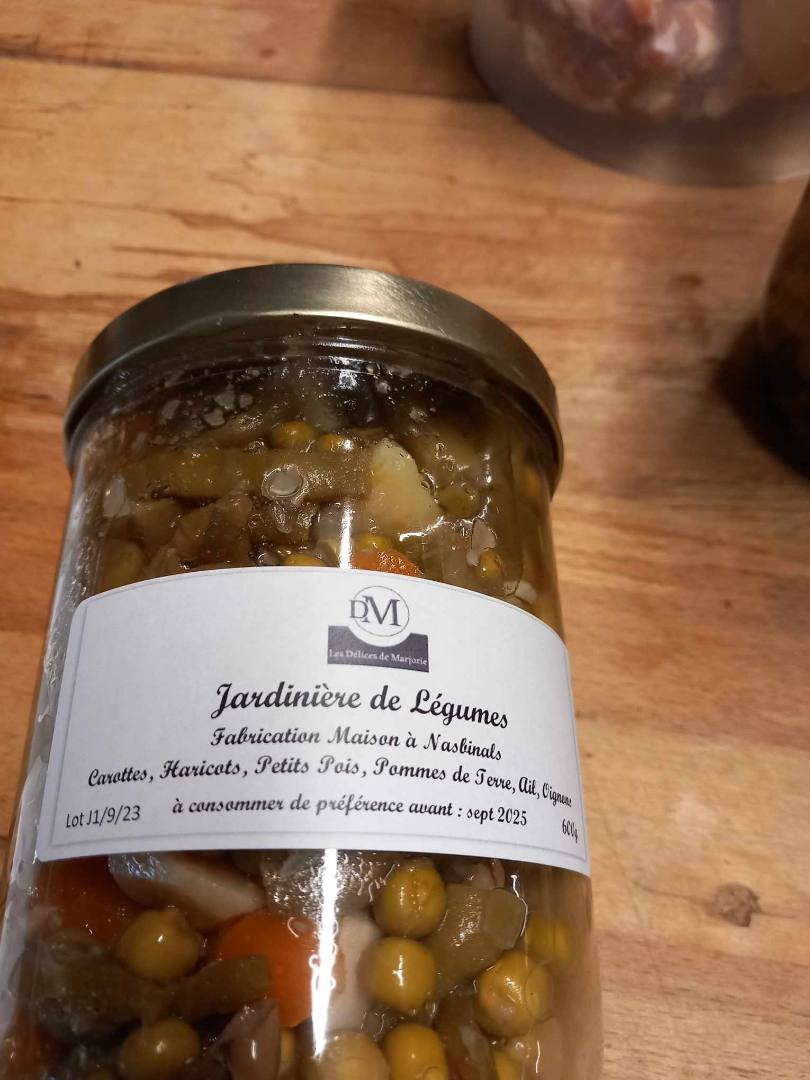 JARDINIERE DE LEGUMES/ HARICOTS VERTS/ BETTERAVES ROUGES /COTES DE BLETTE / RATATOUILLE A LA PROVENCALE / TAPENADE OLIVES NOIRES / TAPENADE OLIVES VERTES / PATE PUR PORC/ PATE SANGLIER/ TARTINADE CHORIZO-CHEVRE/ TRIPES A L'ANCIENNE/ DAUBE DE SANGLI