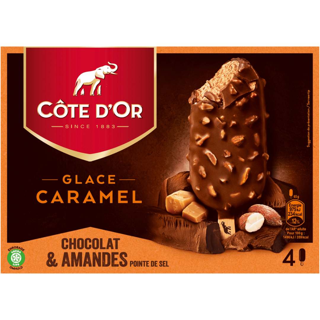 4 Batonnets de glace Caramel enrobage Lait Amandes , Cote d'OR
