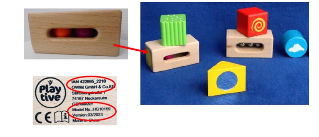 - « jeu d’encastrement ayant des billes colorées » contenu dans le set « Jeu d’encastrement mains / Blocs Montessori» (modèle HG10159).
