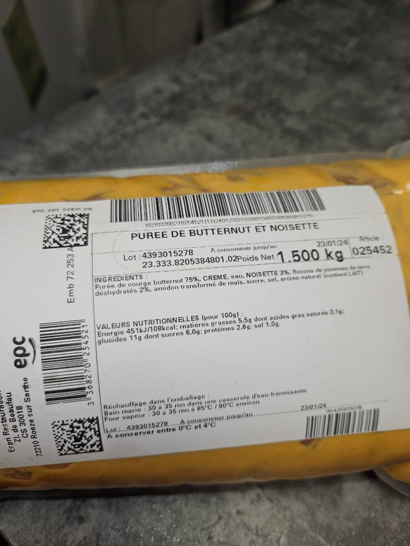 - Purée de butternut orange en Poche sous vide de 1.5kg N° Lot = 4393015278 avec sous lot 23.333.8205384801.02 Il s'agit bien du lot finissant par 02