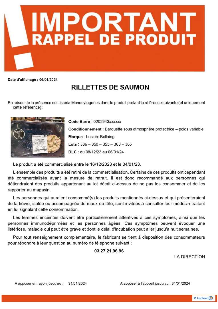 Identification des produits GTIN Lot Date 0202943000000 336 à 365 Date limite de consommation entre le 08/12/2023 et le 06/01/2024 - Conditionnements