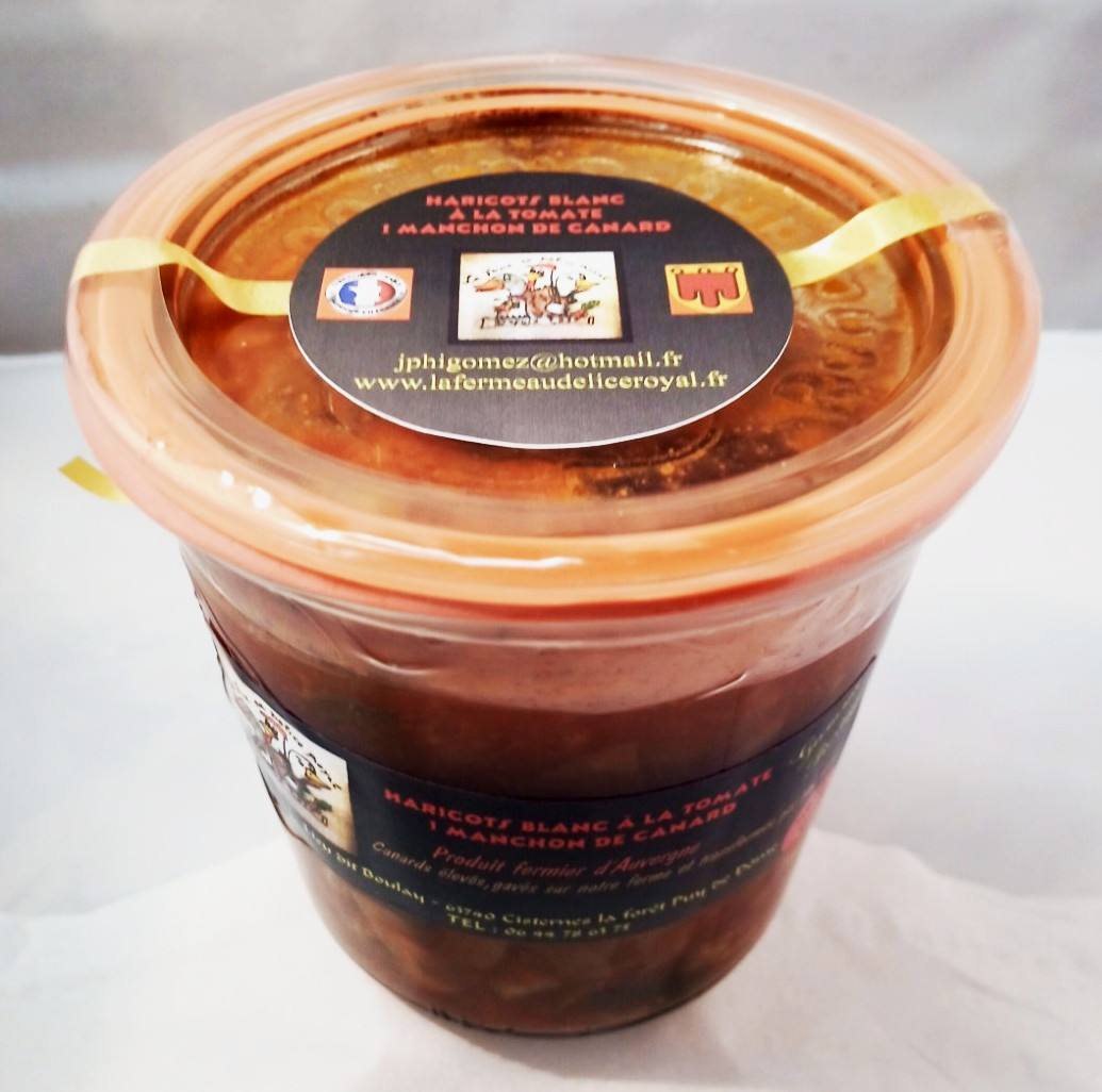- Haricots blancs à la tomate et manchons de canard pour 1 personne 450 gr et 2 personnes 950 gr.