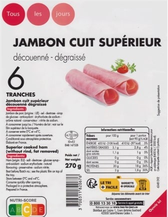 - Jambon cuit supérieur découenné / dégraissé - 6 tranches (270g) / barquette + opercule