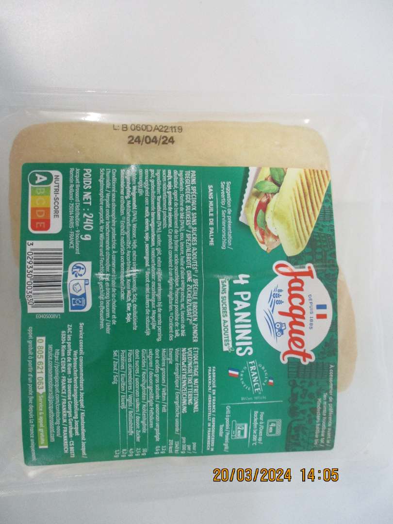 - 4 PANINIS SANS SUCRE AJOUTES JACQUET 240G