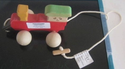 - Présence d'une corde dont l'extrémité n'est pas libre au sens de la norme (présence d'un embout en bois), attachée au jouet et susceptible de s'emmêler. Risque de strangulation