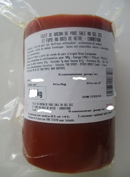 - BACON SALÉ AU SEL SEC ET FUMÉ AU BOIS DE HÊTRE CARREFOUR - vendu à la coupe
