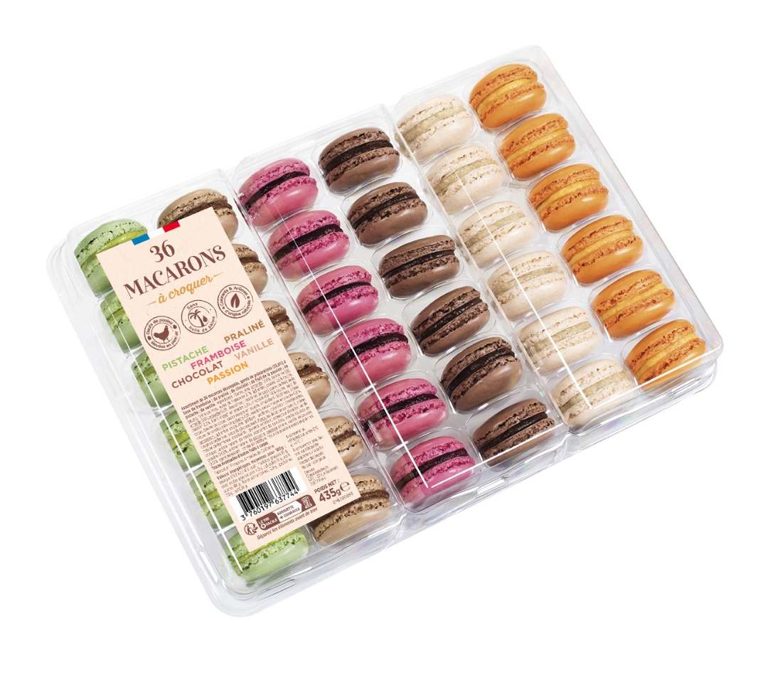 - 36 Macarons à croquer - Pistache, praliné, framboise, chocolat, vanille, passion. Produit décongelé.