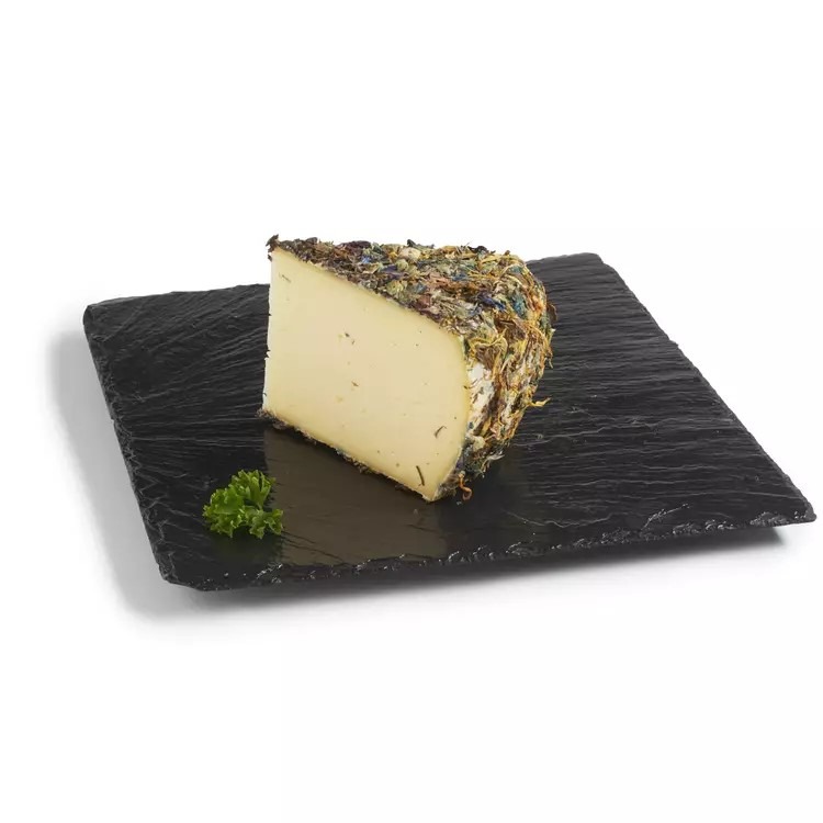 - sous film alimentaire et coupé en triangle sur planchette effet bois + film alimentaire