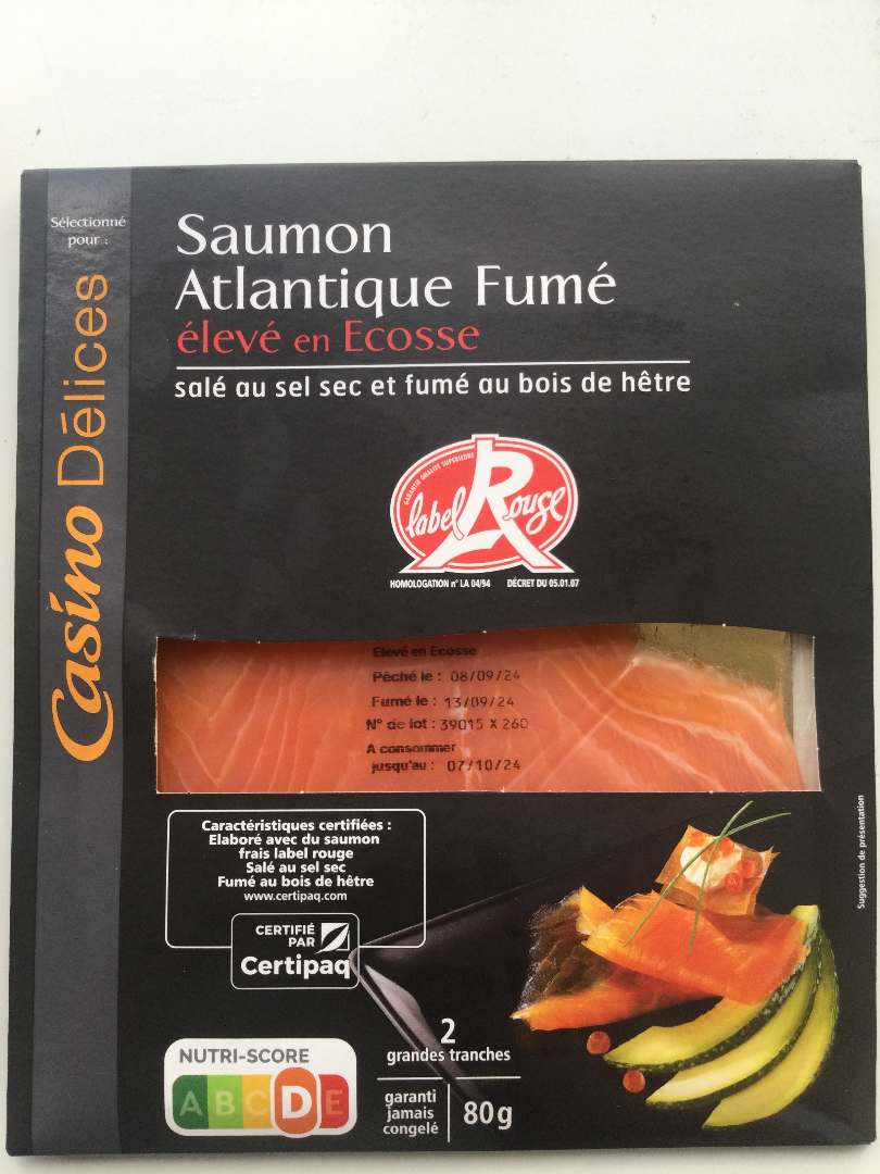 - Saumon Atlantique fumé, élevé en Ecosse, LABEL ROUGE 2 tranches 80g Casino Délices