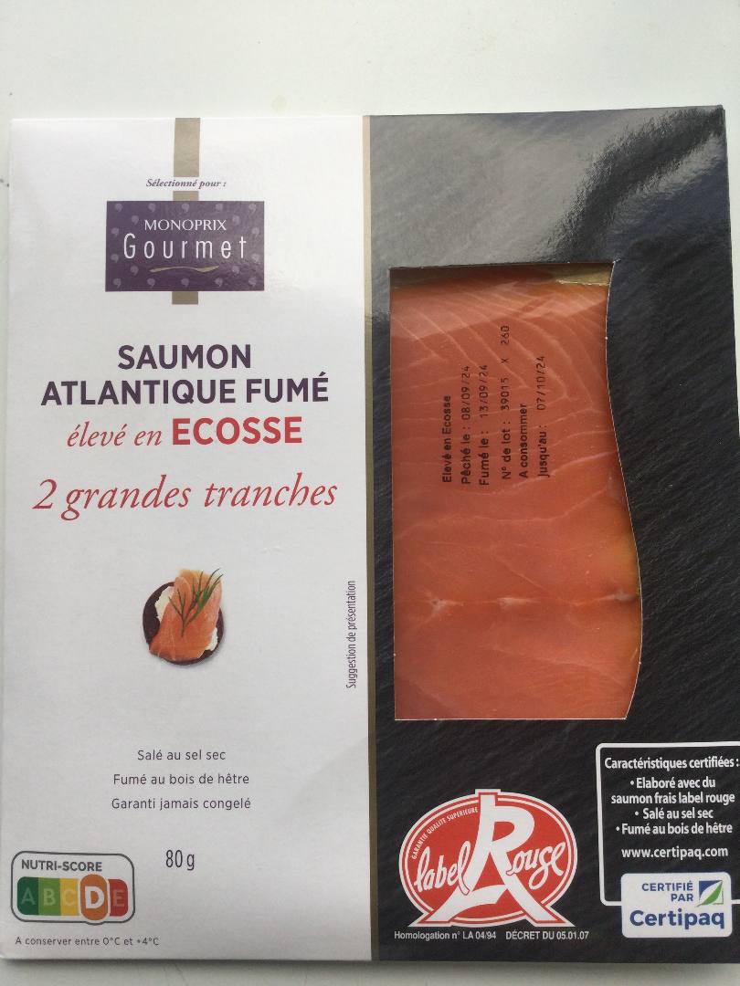 - Saumon Atlantique fumé, élevé en Ecosse, LABEL ROUGE 2 tranches 80g MONOPRIX GOURMET Saumon Atlantique fumé, élevé en Ecosse, LABEL ROUGE 4 tranches 160g MONOPRIX GOURMET