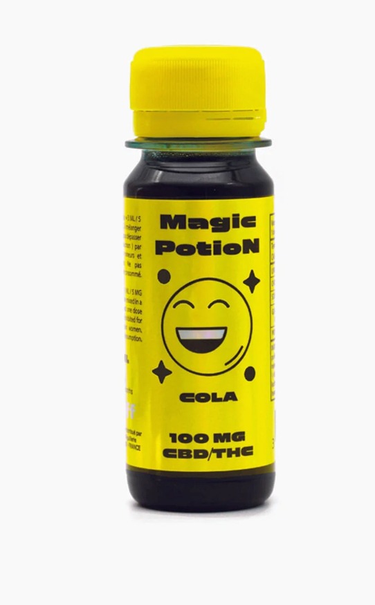 - Etiquette jaune irridéscente. Goût Cola. 100 MG de THC / 100 MG de CBD