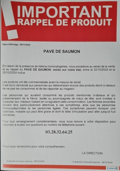 - Les personnes qui auraient consommé les « produits » et qui présenteraient de la fièvre, isolée ou accompagnée de maux de tête, et des courbatures, sont invitées à consulter leur médecin traitant. Les femmes enceintes doivent être particulièrement attentives à ces symptômes, ainsi que les personnes immunodéprimées et les personnes âgées. Ces symptômes peuvent provoquer une listériose, maladie qui peut être grave et dont le délai d'incubation peut aller jusqu'à 8 semaines.