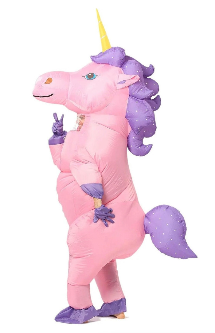 - Tenue licorne gonflable rose avec une crinière, une queue et des pattes violettes. Matière : polyester Costume composé d'une paire de gants, de 2 boîtes à piles, de 2 ventilateurs Fermeture frontale zippée Partie transparente existante pour un visu extérieur