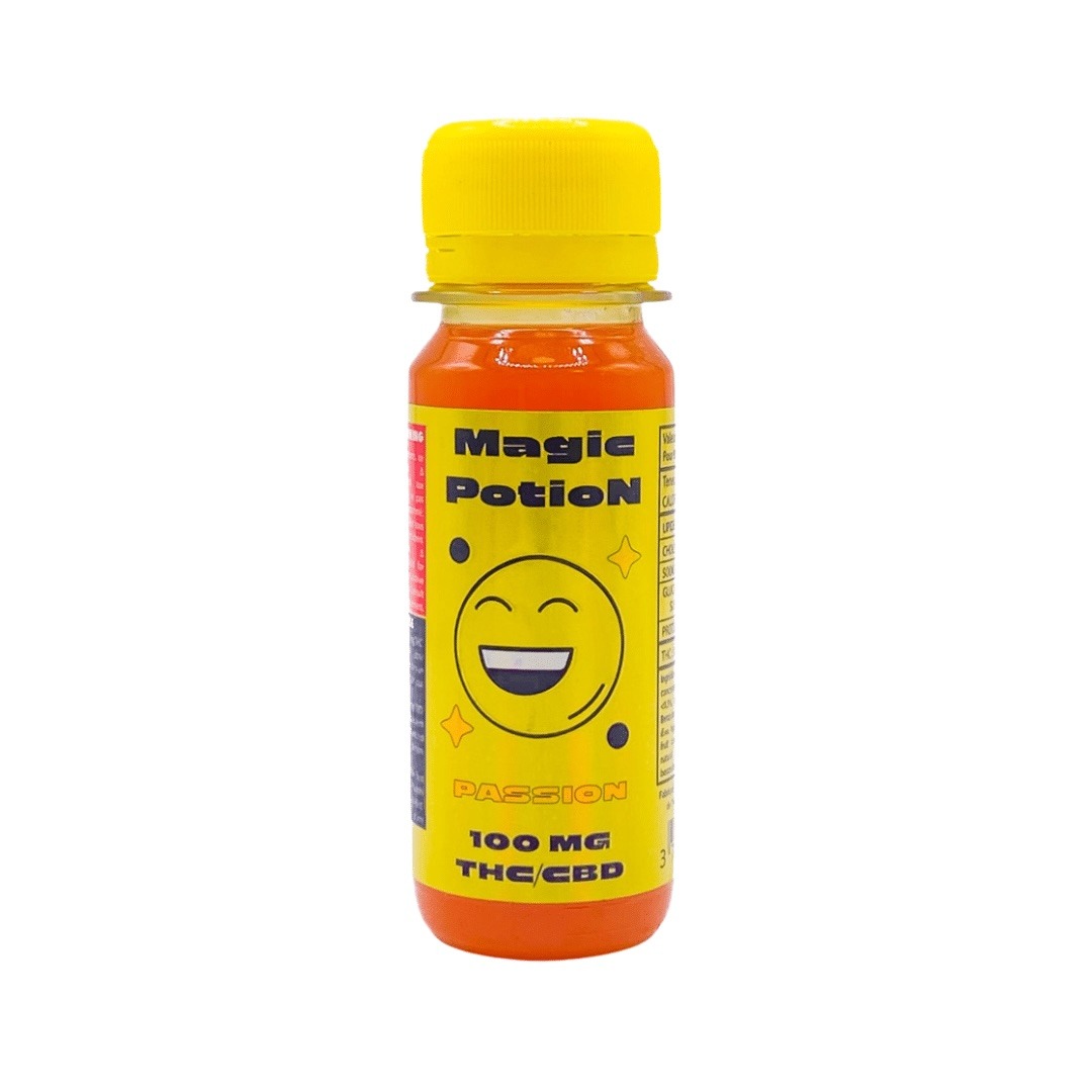- Etiquette jaune irridéscente. Goût Passion. 100 MG de THC / 100 MG de CBD