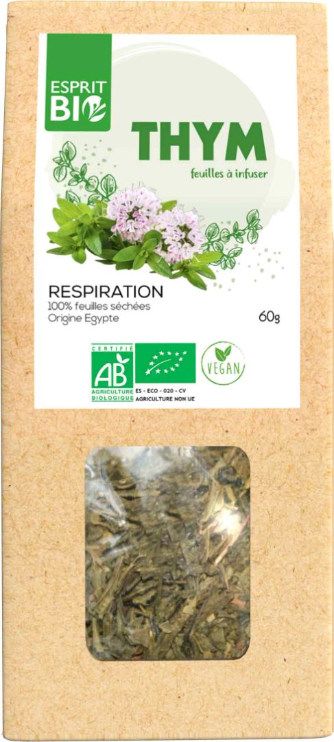 - Etui en carton de couleur kraft avec fenêtre en plastique . Contenance de 60g de thym en vrac