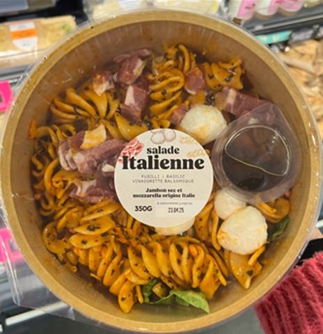 - Salade italienne 350 g Salade à base de pâtes assaisonnées, mozzarella, jambon sec, salade et vinaigre balsamique.