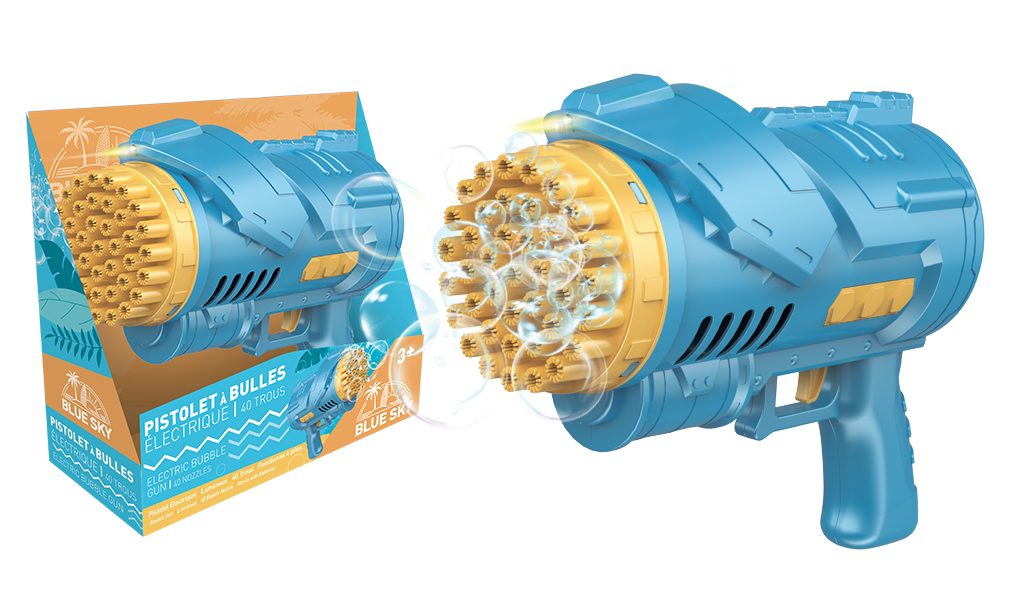 PISTOLET A BULLES ELECTRIQUE 23 CM - 40 TROUS - LUMINEUX - LIQUIDE BULLES INCLUS - APD 3 ANS