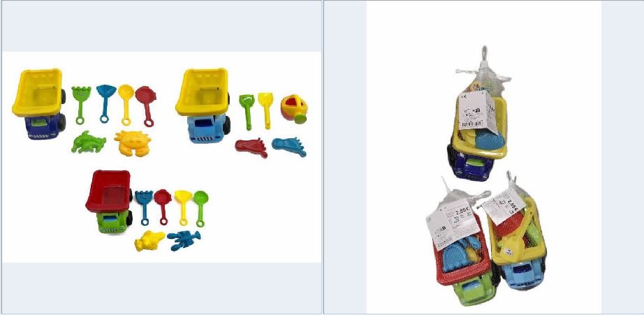 - jeux en plastique pour la plage : en forme de benne avec ustensiles de plages