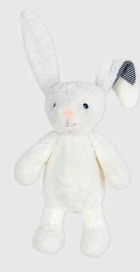 - Lapin en peluche blanc, avec intérieur des oreilles rayé blanc et bleu.