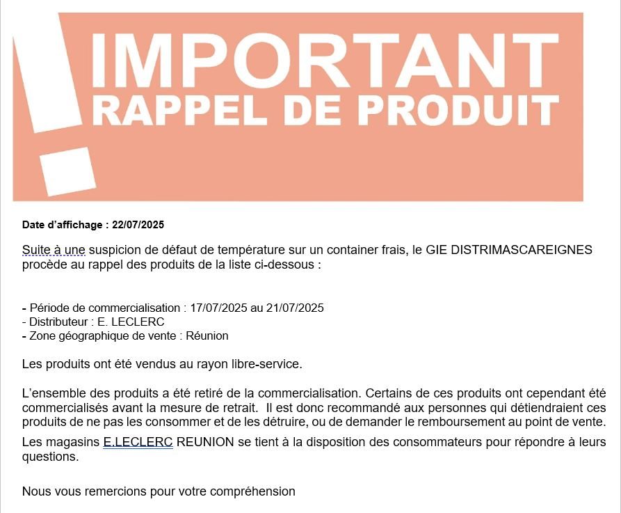 - L'ensemble des produits concernés ont été commercialisés entre le 17/07/2025 au 21/07/2025. Se rapprocher impérativement des magasins E.LECLERC REUNION pour avoir plus d'information sur les produits concernés dans chaque magasin.