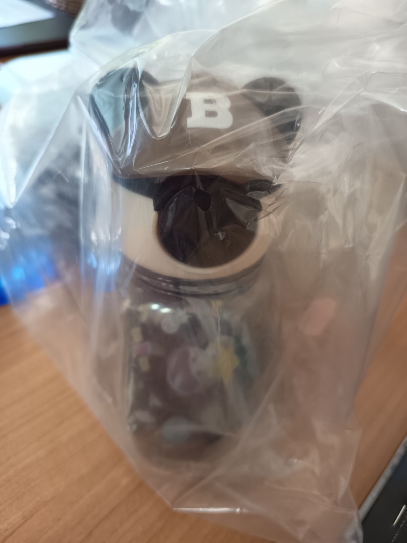 - Gourde Naughty Bear, composé d’un couvercle en forme de casquette marquer d’un «B» à ouverture par pression et paille en plastique intégré et un cordons pour accrocher la gourde au tour du cou.