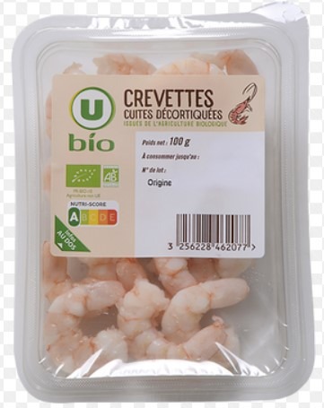 - Crevettes U bio décortiqués cuites nature bq.100g transformé France