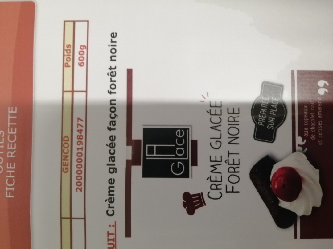 - crème glacée foret noire, crème glacée fromage blanc, crème glacée pistache, crème glacée praline, crème glacée tiramisu