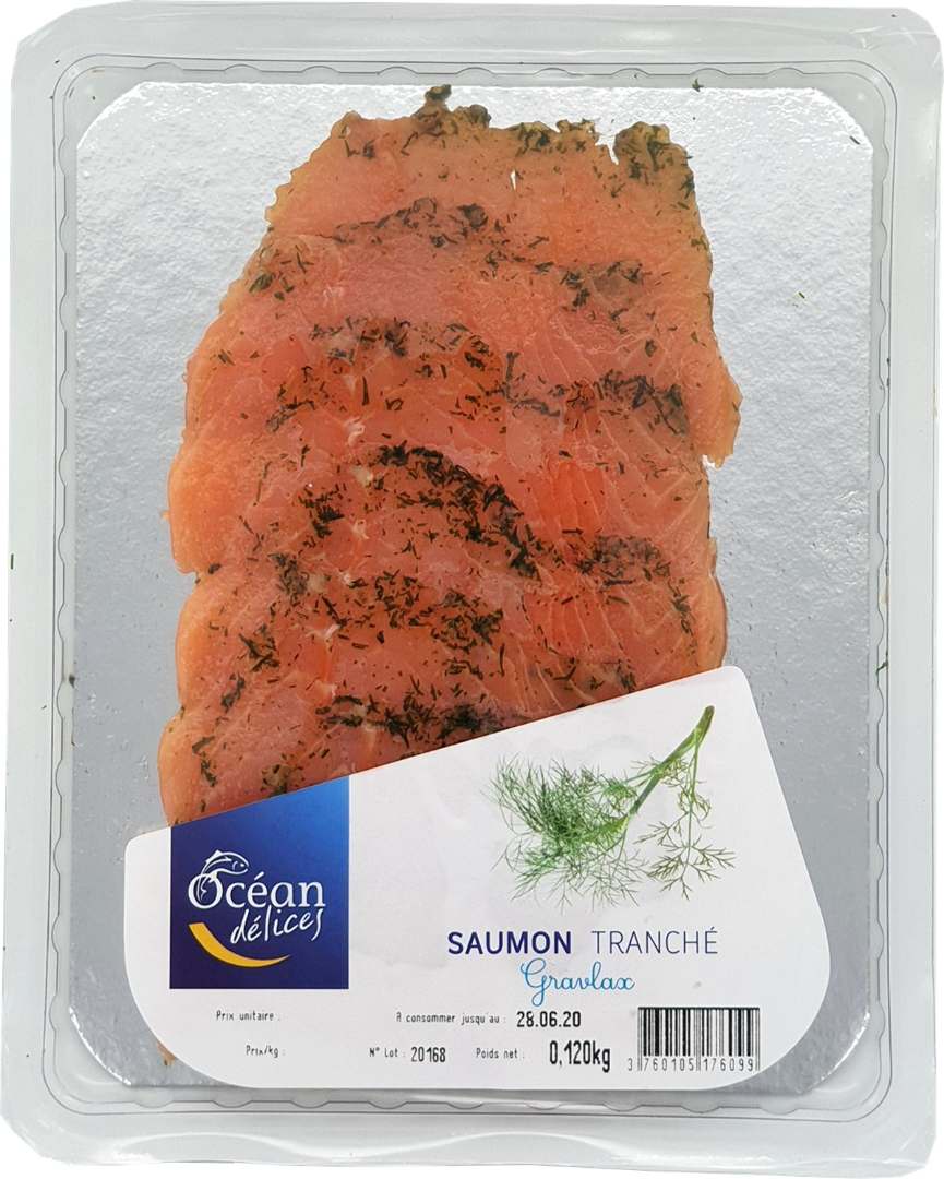- SAUMON TRANCHE GRAVLAX 120 g , conditionné en barquette plastique operculée sous atmosphère protectrice, Lot 21244, DLC: 13/09/2021 EAN13: 3760105176099
