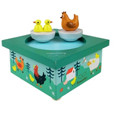 - La Boîte à Musique Dancing Jouet de boîte musicale bleu avec une poule dansante et des canaris. Produit vendu en ligne, notamment via Amazon.