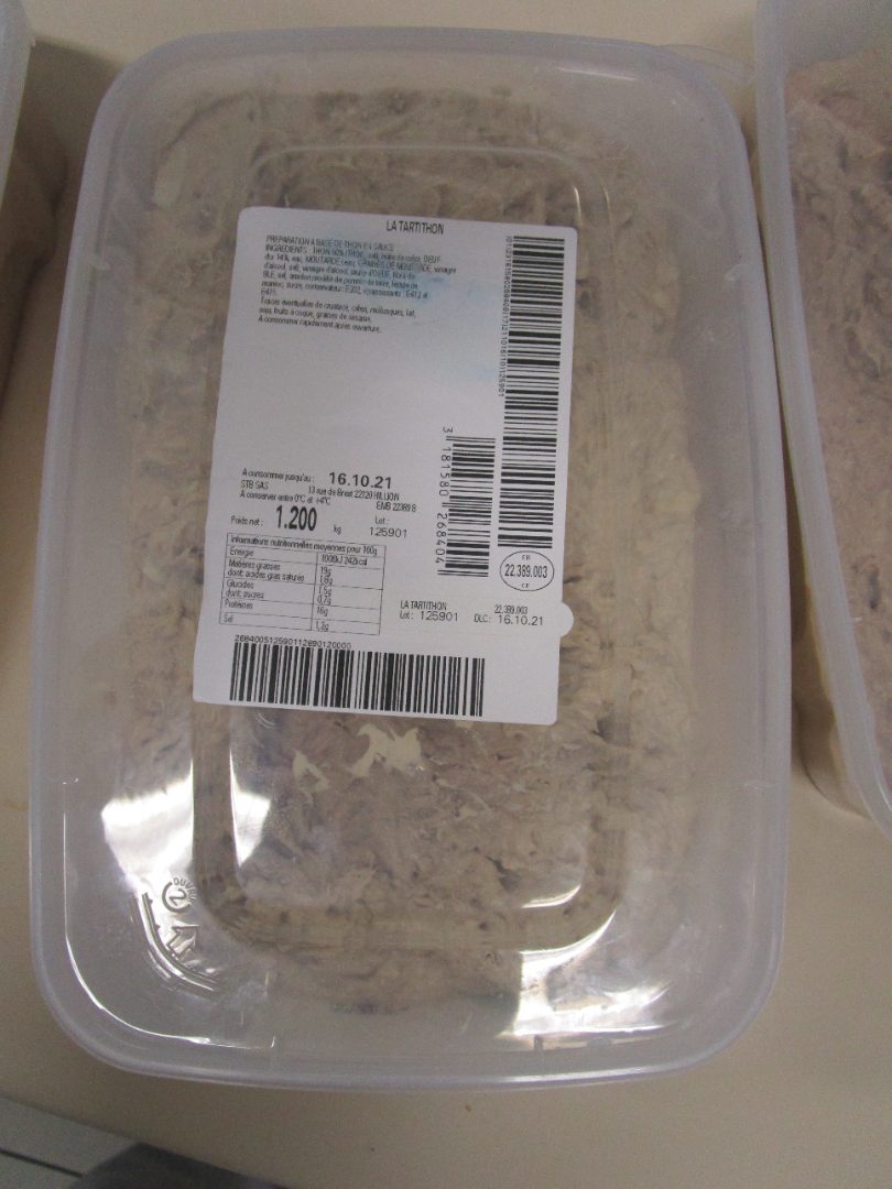 - barquette de 1,4 kg , préparation à base de thon . Cette préparation est utilisée pour la préparation de sandwich.