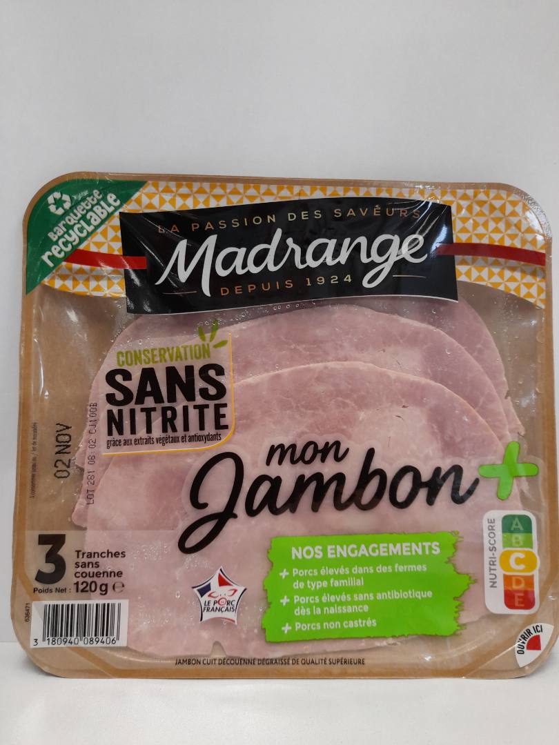 - Jambon cuit supérieur 3 tranches (120 g) conservation sans nitrite Madrange