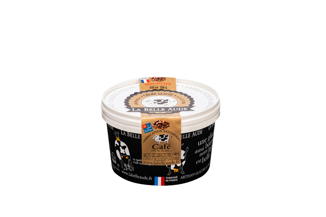Crèmes glacées 550 ml : Café 100% Arabica, Caramel à la crème et fleur de sel de Gruissan, Chocolat, Marron avec morceaux de marron glacé, Menthe avec feuilles de menthe et copeaux de chocolat.