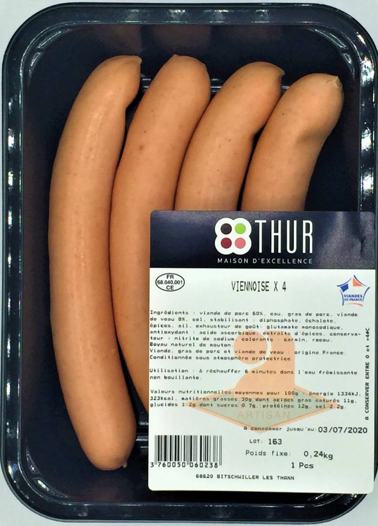 Identification des produits GTIN Lot Date 3760050065165 314 (viennoise par 4) Date limite de consommation 03/12/2021 3760050060238 314 (viennoises par 4) Date limite de consommation 01/12/2021 3760050065066 314 (viennoises par 1kg) Date limite de consommation 03/12/2021 3760050060535 314 (viennoises à la coupe) Date limite de consommation 03/12/2021 - Conditionnements