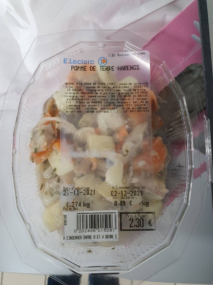 - Produit vendu en barquette au rayon traiteur libre-service sous le libellé : Pomme de terre/harengs Date d'emballage : 25/11/2021; DLC : 30/11/2021 Et Date d'emballage : 27/11/2021; DLC : 02/12/2021