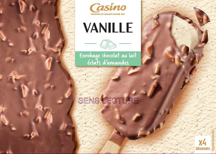 Maxi bâtonnets vanille enrobage chocolat au lait et amandes grillées x4 314g / 440ml Casino