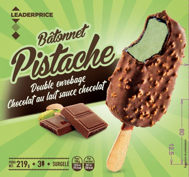 Bâtonnet Pistache double enrobage chocolat au lait sauce chocolat x3 219g – Leader Price