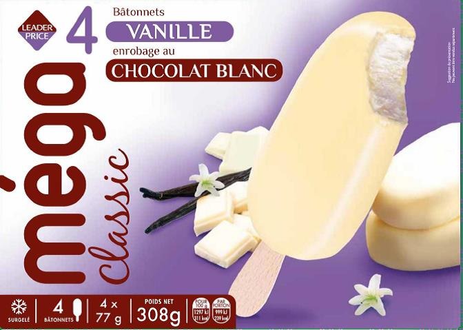 Méga Classique – 4 Bâtonnets Vanille enrobage au chocolat blanc – 308g / 440 ml – Leader Price