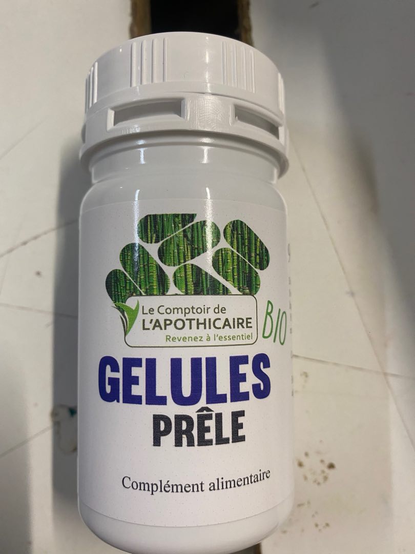 - Pots de 200 et de 90 gélules contenant de la poudre de prêle biologique